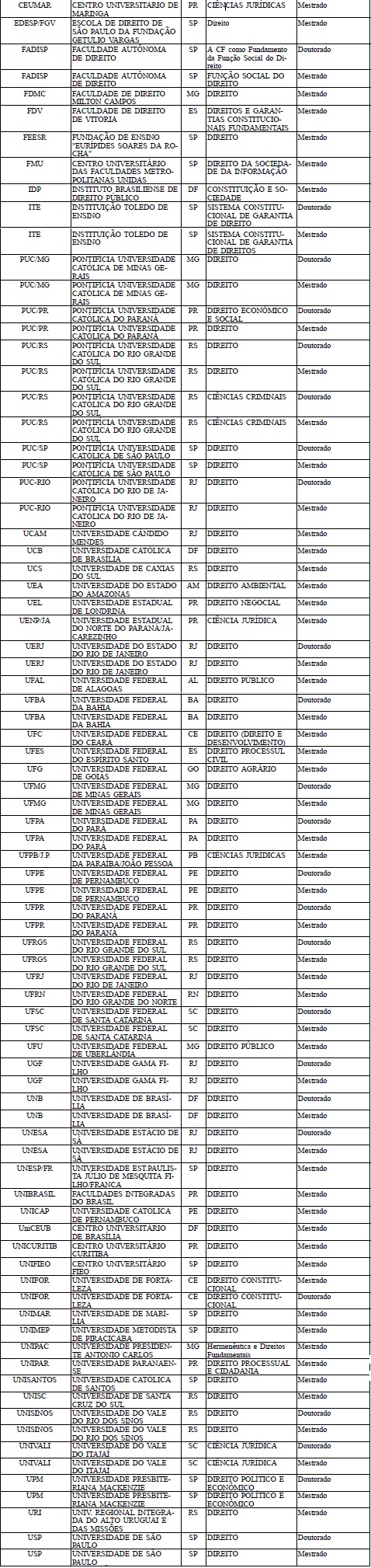 O MEC reconheceu mais de 4 mil cursos de pós-graduação. Dentre as áreas avaliadas, 82 faculdades de Direito obtiveram aprovação de seus cursos de mestrado e doutorado. Veja abaixo: